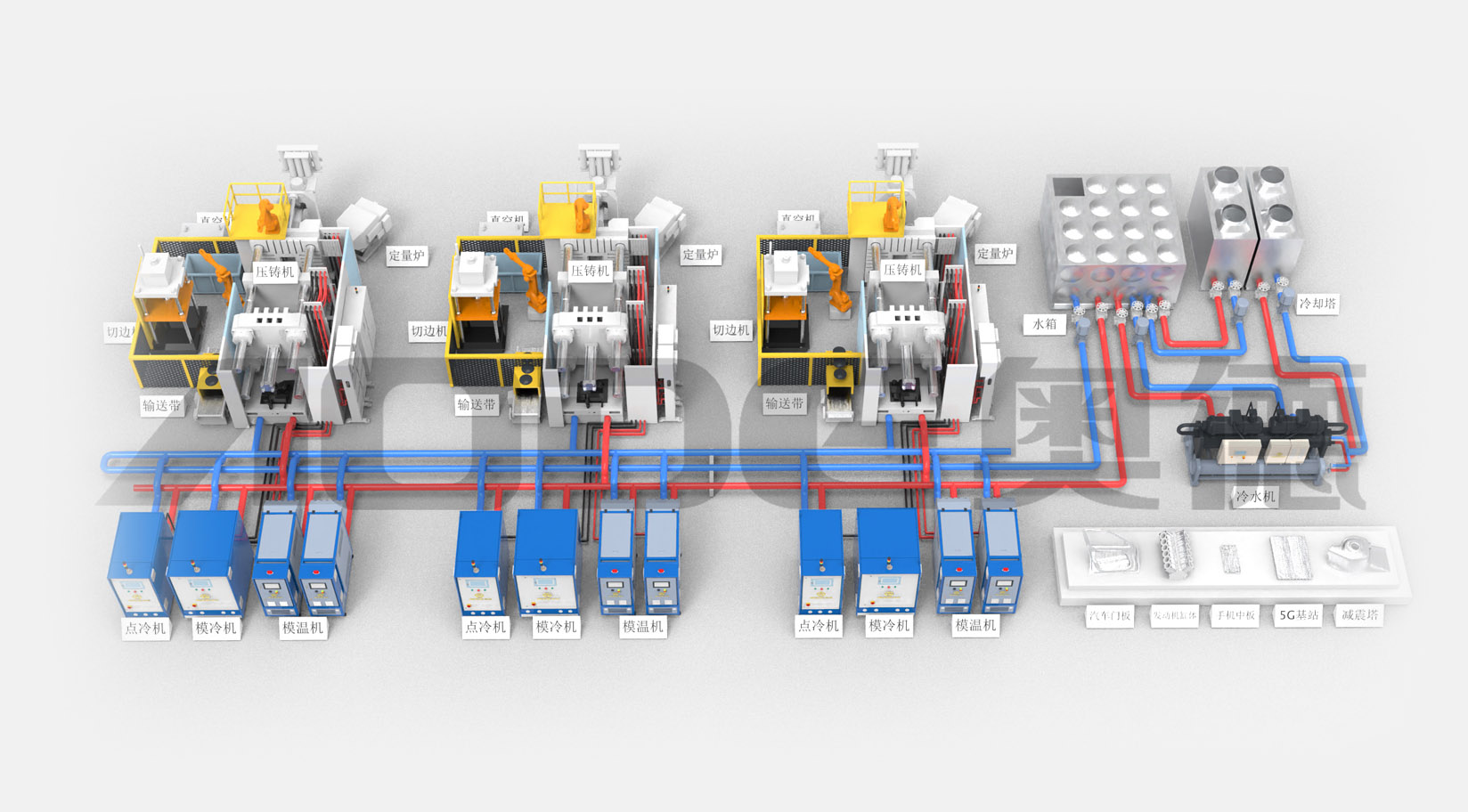 2.壓鑄溫控島一站式交付:模溫機(jī),點(diǎn)冷機(jī),模冷機(jī),冷水機(jī),純水機(jī),模具管道清洗機(jī).